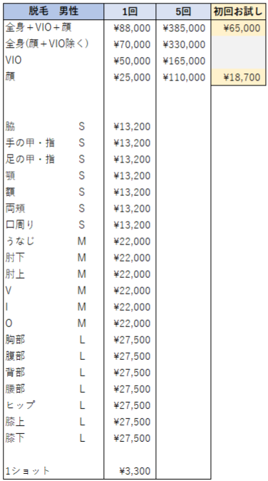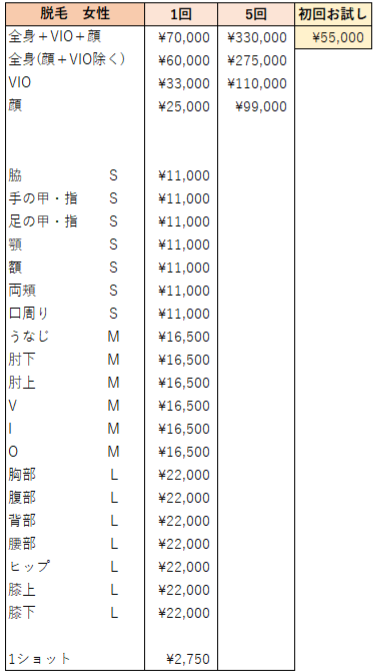 ジュニア脱毛(小学6年生まで)下記金額より20% OFFです。